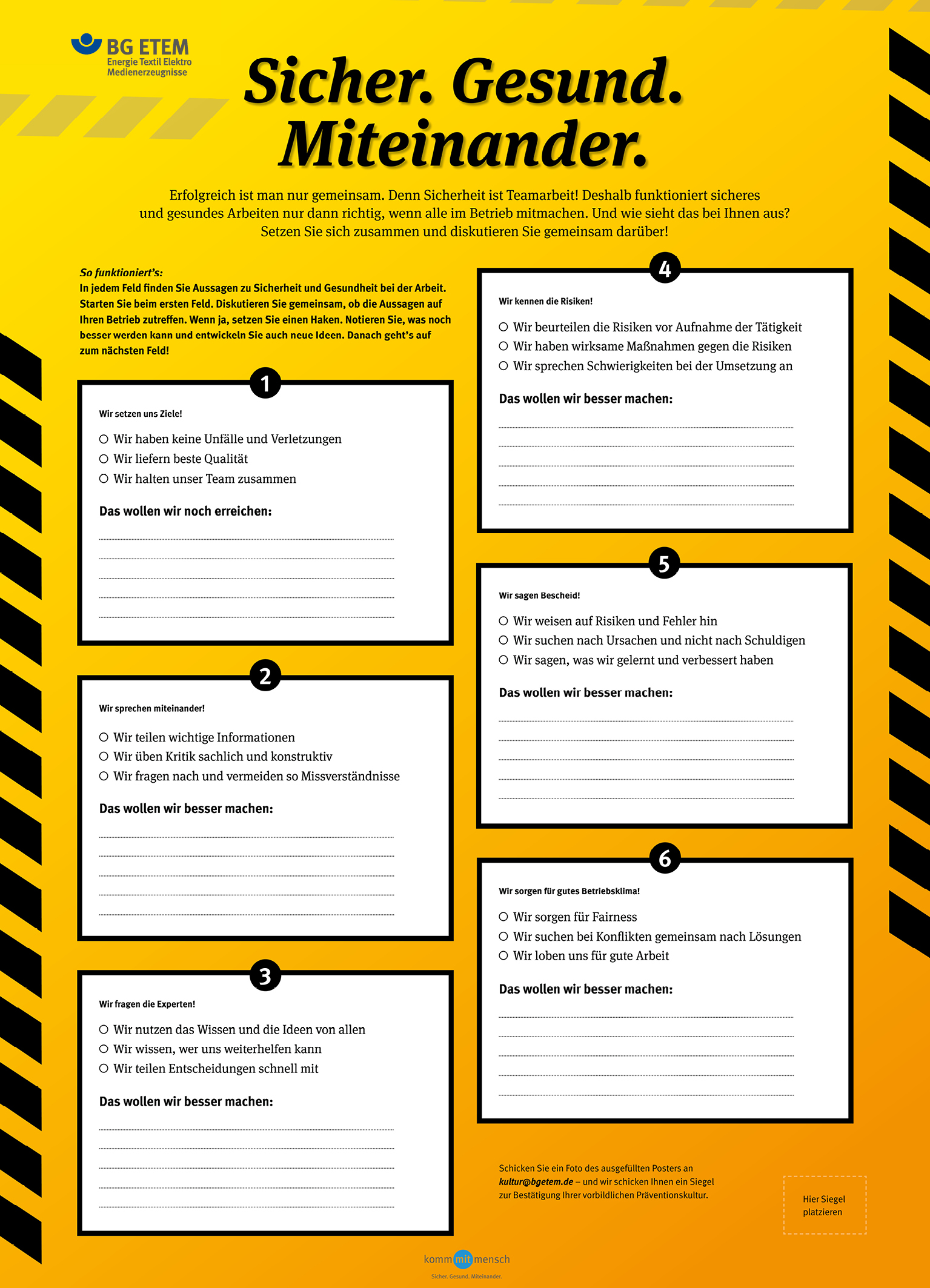 Unternehmen, die alle sechs Themen bearbeitet haben, werden als kommmitmensch-Betrieb ausgezeichnet. Ein von der BG ETEM verliehenes Siegel bestätigt ihren Erfolg sichtbar. Dazu schickt man einfach ein Foto des bearbeiteten Posters per E-Mail an kultur@bgetem.de.