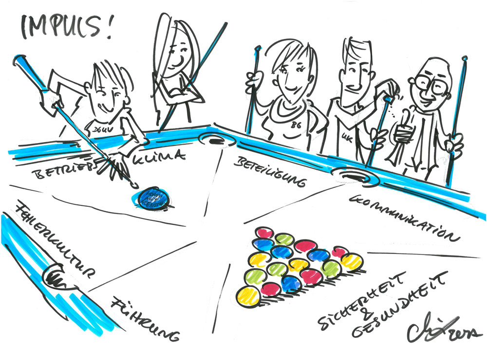 Der Dialog über verschiedene betriebliche Handlungsfelder schärft bei allen Beteiligten das Verständnis, wie sicheres und gesundes Verhalten auf einem hohen Niveau funktionieren kann - für sich selbst und für andere. Mit den Dialogen steigen eigens zusammengestellte Teams in die Diskussion ein und erarbeiten gemeinsam eigene Lösungsansätze.