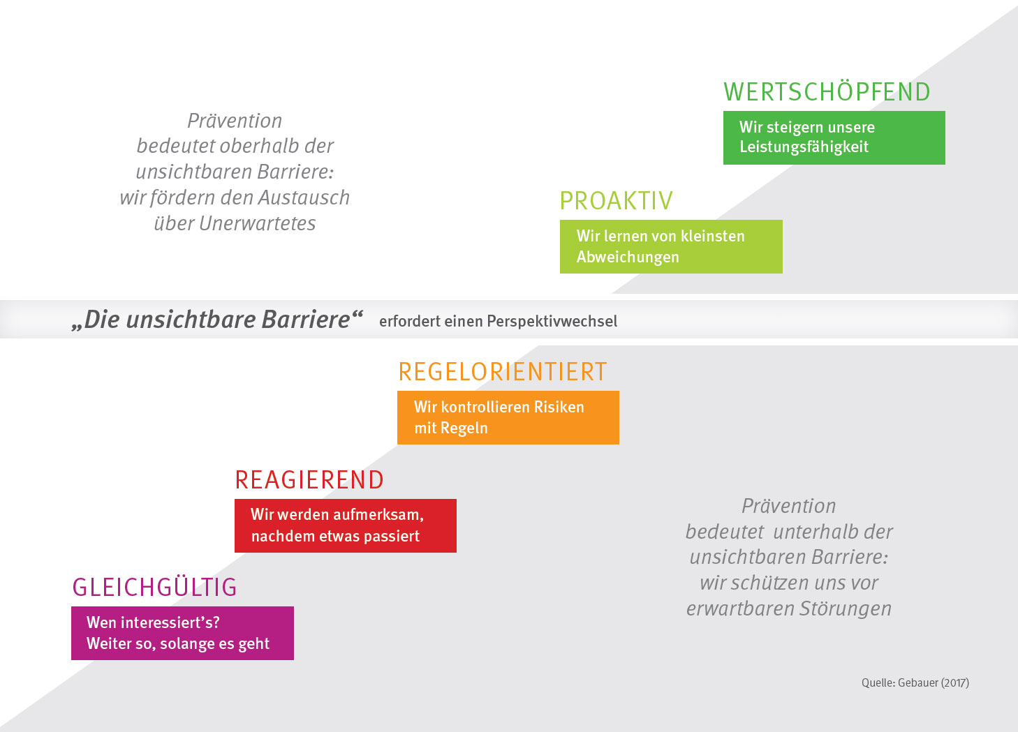 Das Modell beschreibt einen Prozess der kontinuierlichen Verbesserung. Die ersten drei Stufen stehen für einen noch nicht selbstverständlichen Umgang mit den Themen Sicherheit und Gesundheit. Auf den höheren Stufen werden Unfälle und Erkrankungen mit einem anderen Blick betrachtet: Mögliche Folgen für Sicherheit und Gesundheit werden bei Entscheidungen und Aktivitäten selbstverständlich bedacht - dann ist der Perspektivwechsel gelungen.