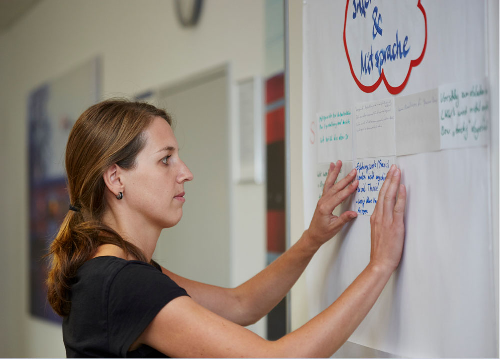 Die Moderatorin gibt die Anweisung, dass sich die Teilnehmer paarweise untereinander austauschen sollen, um möglichst zu jedem Schwerpunktthema eine typische Situation zu finden. Jedes Paar bekommt von ihr mehrere weiße Moderationskarten.