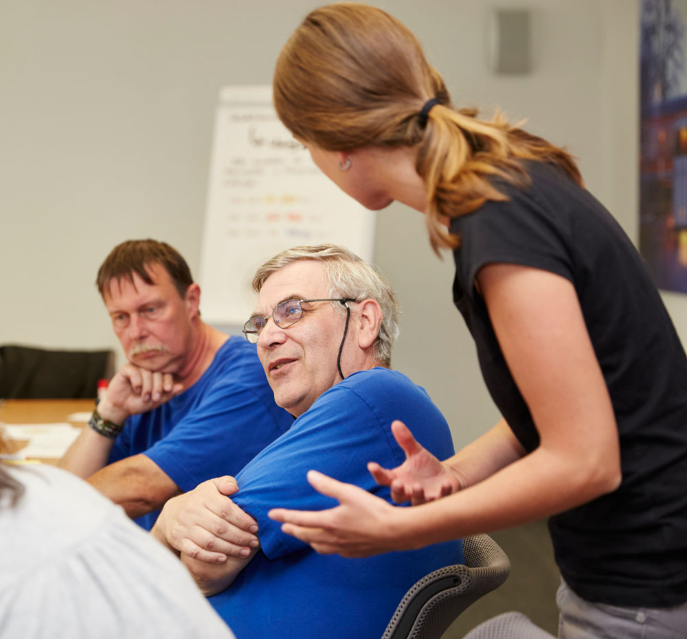 Während in den Kleingruppen an möglichen Lösungen gearbeitet wird, ist die Moderatorin für Fragen ansprechbar. Sie hört kurz in die Diskussion einer Gruppe rein, beantwortet Fragen und weist immer wieder darauf hin, dass möglichst konkrete Lösungen gebraucht werden.