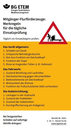 Im täglichen Betriebsablauf kommt es hin und wieder zu Schäden an den Flurförderzeugen, die nicht gemeldet und deshalb auch nicht behoben werden. Damit auch solche Mängel frühzeitig erkannt werden, schreibt die DGUV Vorschrift 68 zusätzlich zur UVV-Prüfung eine tägliche Einsatzprüfung durch den Fahrer vor. Vor Arbeitsbeginn ist der technische Zustand der Gabelstapler und Mitgänger-Flurförderzeuge zum Beispiel mit einer Checkliste festzustellen und zu dokumentieren. Für Gabelstapler und Mitgänger-Flurförderzeuge können Merkregeln für die tägliche Einsatzprüfung als Aufkleber bestellt werden.