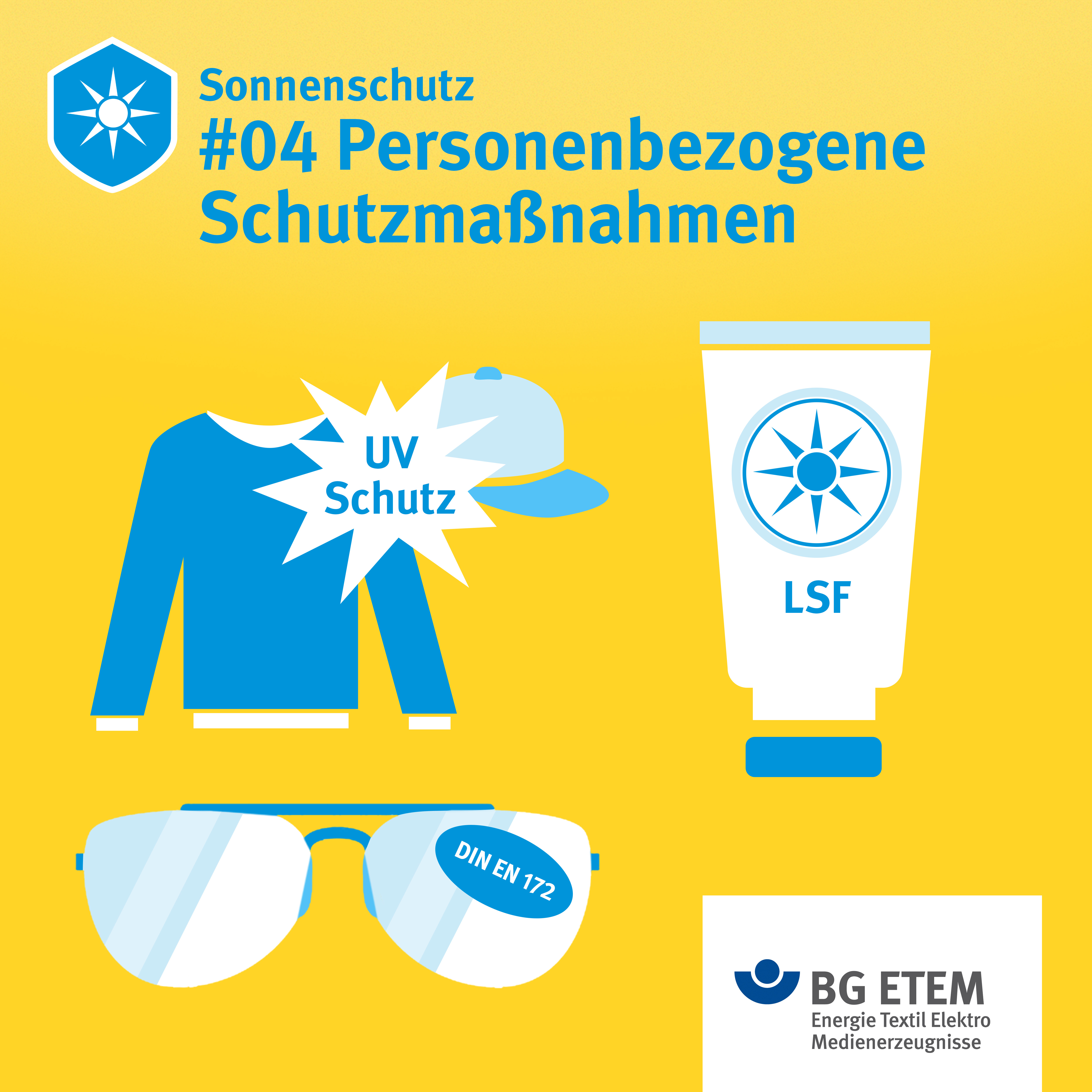 Sonnenschutz im Betrieb: Wie kann ich mich selbst schützen? Kleidung und Kopfbedeckung mit entsprechendem UV-Schutz, Sonnenbrille und UV-Schutzmittel mit ausreichendem Lichtschutzfaktor zählen zu den personenbezogenen Schutzmaßnahmen.