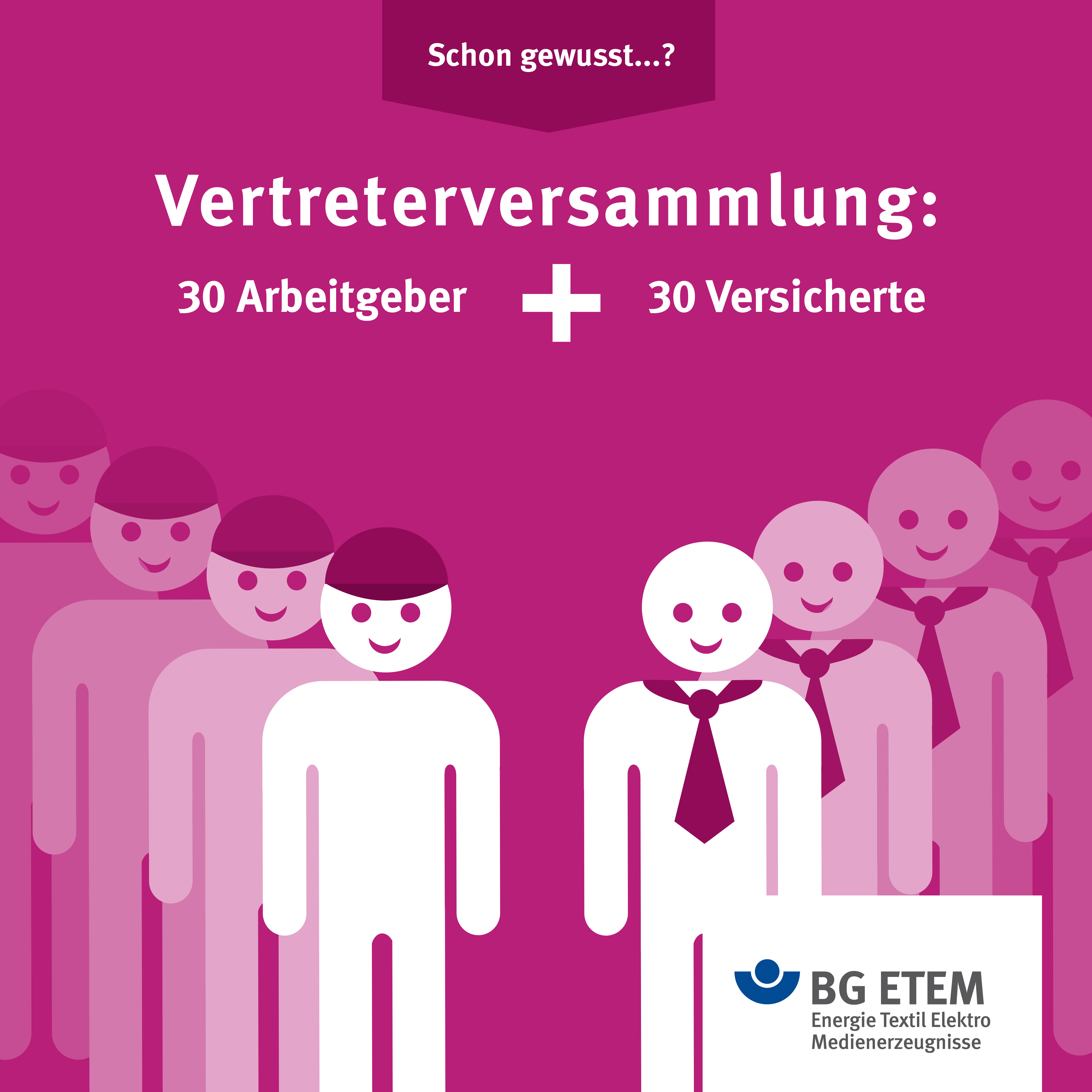 Die Vertreterversammlung ist das Parlament der Berufsgenossenschaft. Sie setzt sich aus jeweils 30 Vertreterinnen und Vertretern der Arbeitgeber und der Versicherten zusammen. Die Vertreterversammlung beschließt unter anderem die Satzung sowie Unfallverhütungsvorschriften und entscheidet über den Gefahrtarif. Das ist gut für alle Mitglieder der BG ETEM, denn die Mitglieder der Vertreterversammlung kennen Risiken und Gefahren aus ihrem Arbeitsalltag sehr genau.