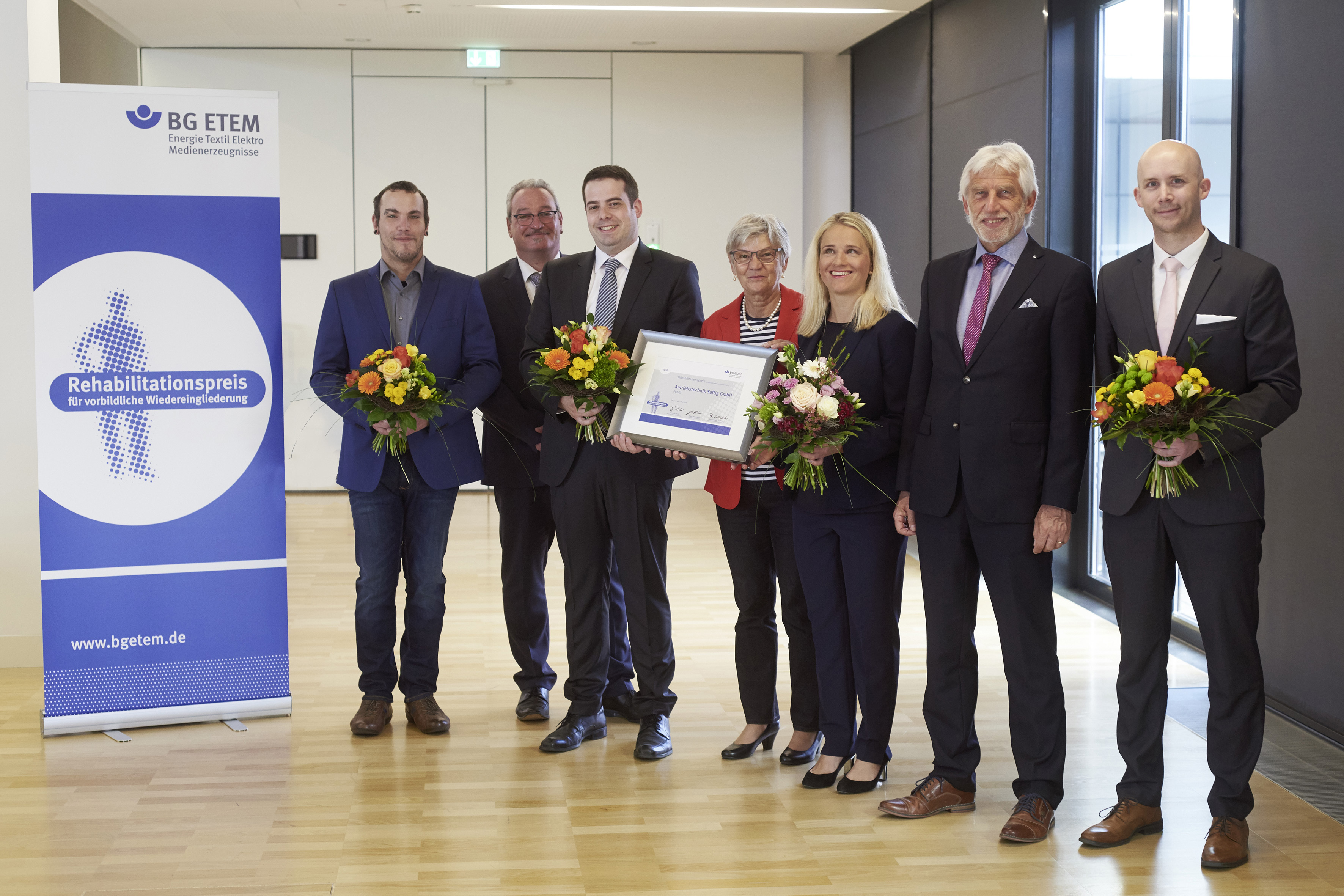 Mit dem Rehabilitationspreis für vorbildliche Wiedereingliederung zeichnet die BG ETEM das Unternehmen Antriebstechnik Saftig aus dem rheinland-pfälzischen Plaidt aus. Den Preis übergaben die scheidende Behinderten-Beauftragte der Bundesregierung, Verena Bentele, und Karin Jung, Vorsitzende der Vertreterversammlung der BG ETEM am 09.05.2018 in Dresden. Auf dem Bild von links: Manuel Sebastinany, Antriebstechnik Saftig GmbH, Hans-Peter Kern, BG ETEM, Nico Saftig, Karin Jung, BG ETEM, Verena Bentele, Dr. Bernhard Ascherl, BG ETEM, Michael Thum, Antriebstechnik Saftig GmbH (Foto: Stephan Floss/BG ETEM)